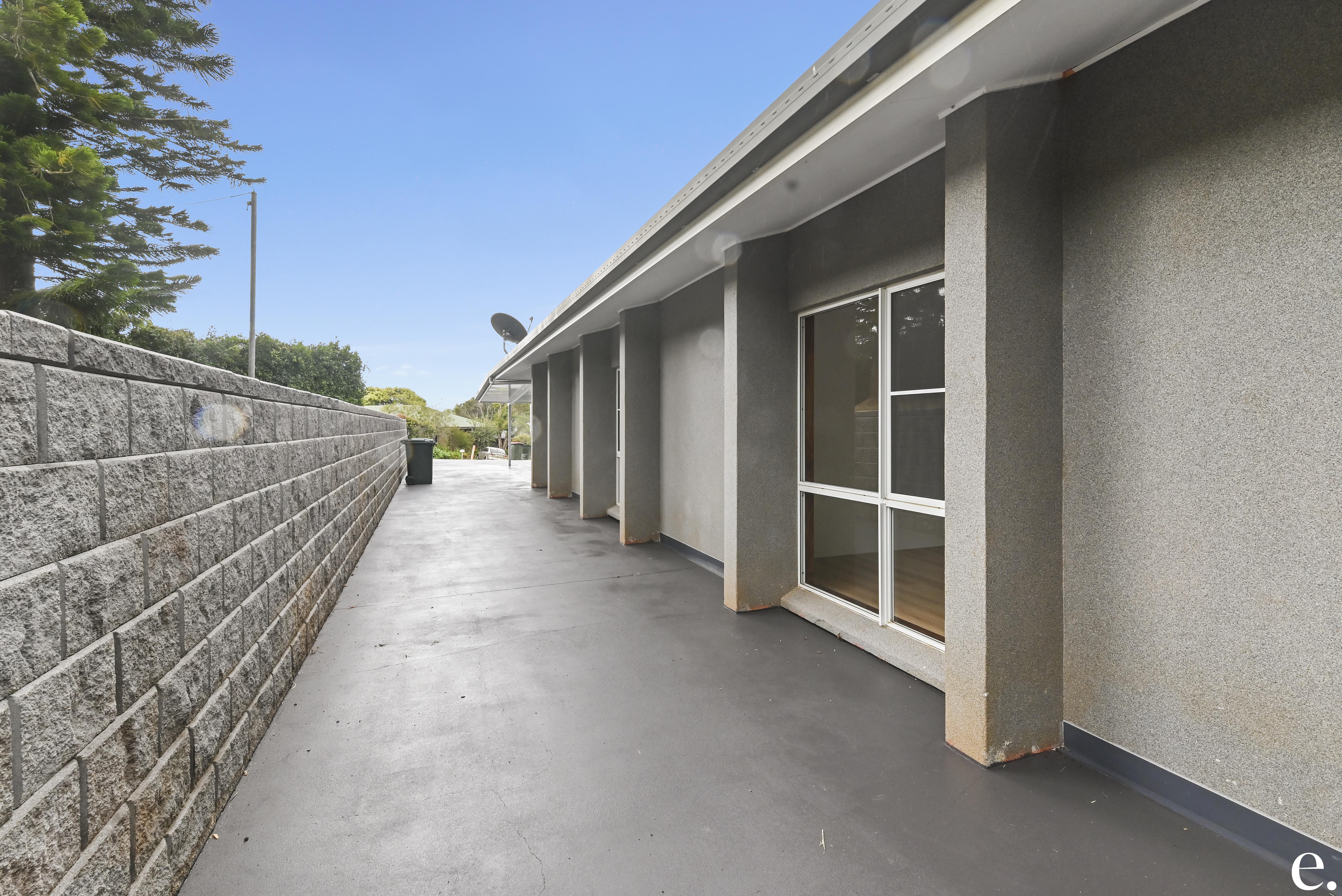 The home boasts a spacious open-plan layout, bathed in natural light throughout the day. The well-appointed kitchen features a Bosch dishwasher, ample counter space, and plenty of power points for convenience. Natural light continues to flow down the wide hallway, leading to generously sized bedrooms on either side. The master bedroom is a standout, with sliding doors that open out to the yard and a walk-in robe.