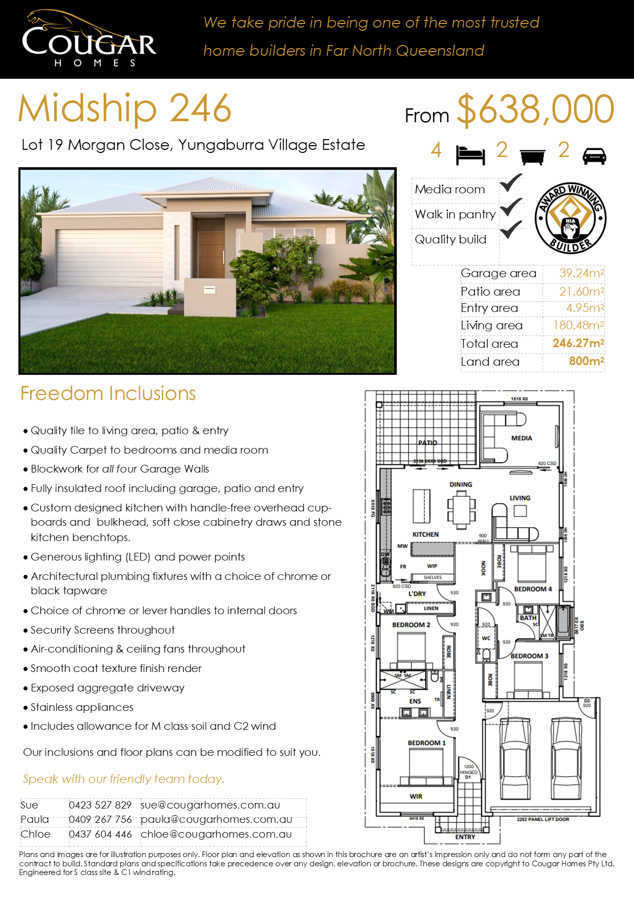 Cougar House and Land package Why not build your beautiful new Cougar Home in Yungaburra Village Estate where climate and culture are a perfect match to escape the city but still enjoy the surrounding countryside activities, cafes and restaurants and lakeside fun. The beautiful Midship 246 comes with our standard Cougar Freedom Inclusions: • Quality tile to living area, patio & entry • Quality Carpet to bedrooms and media room • Blockwork for all four Garage Walls